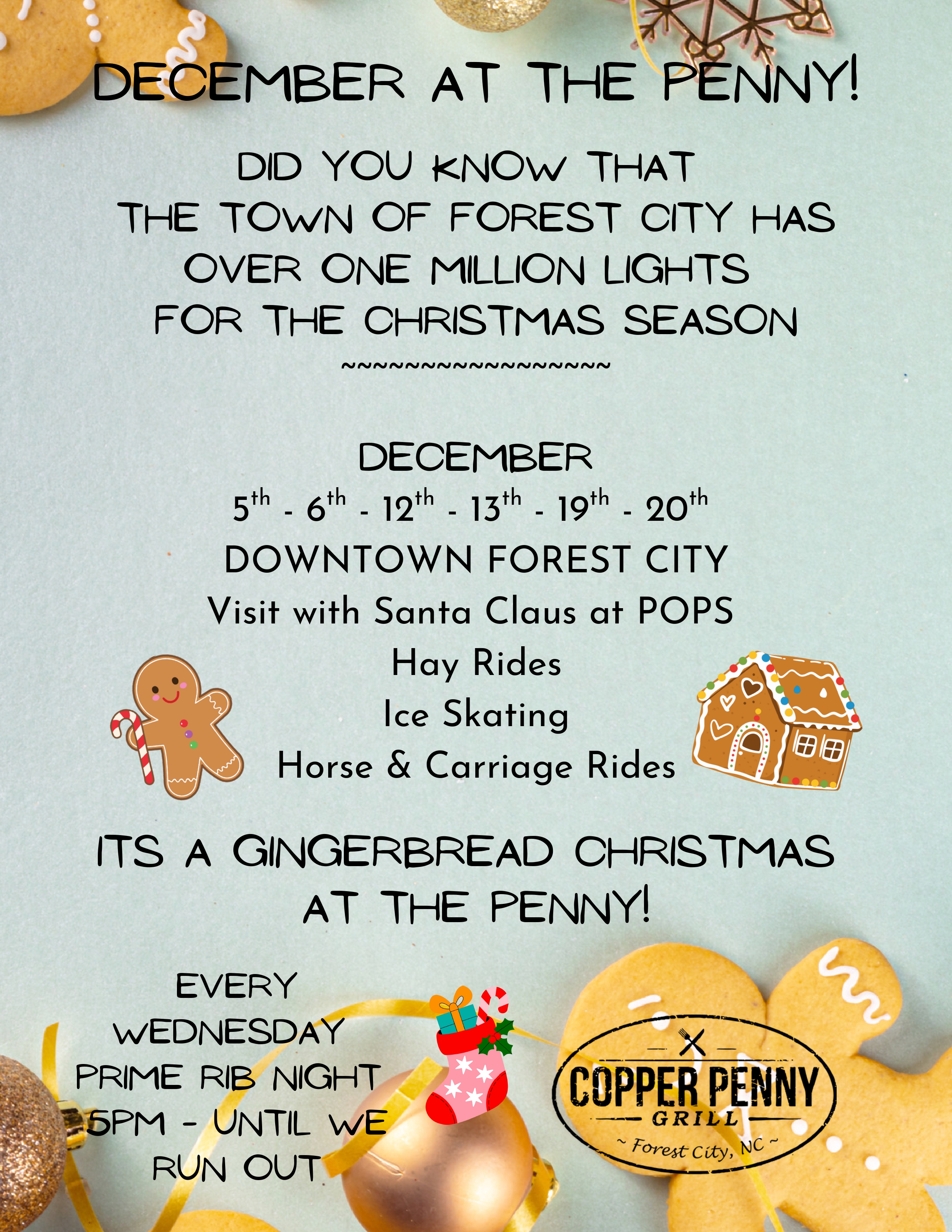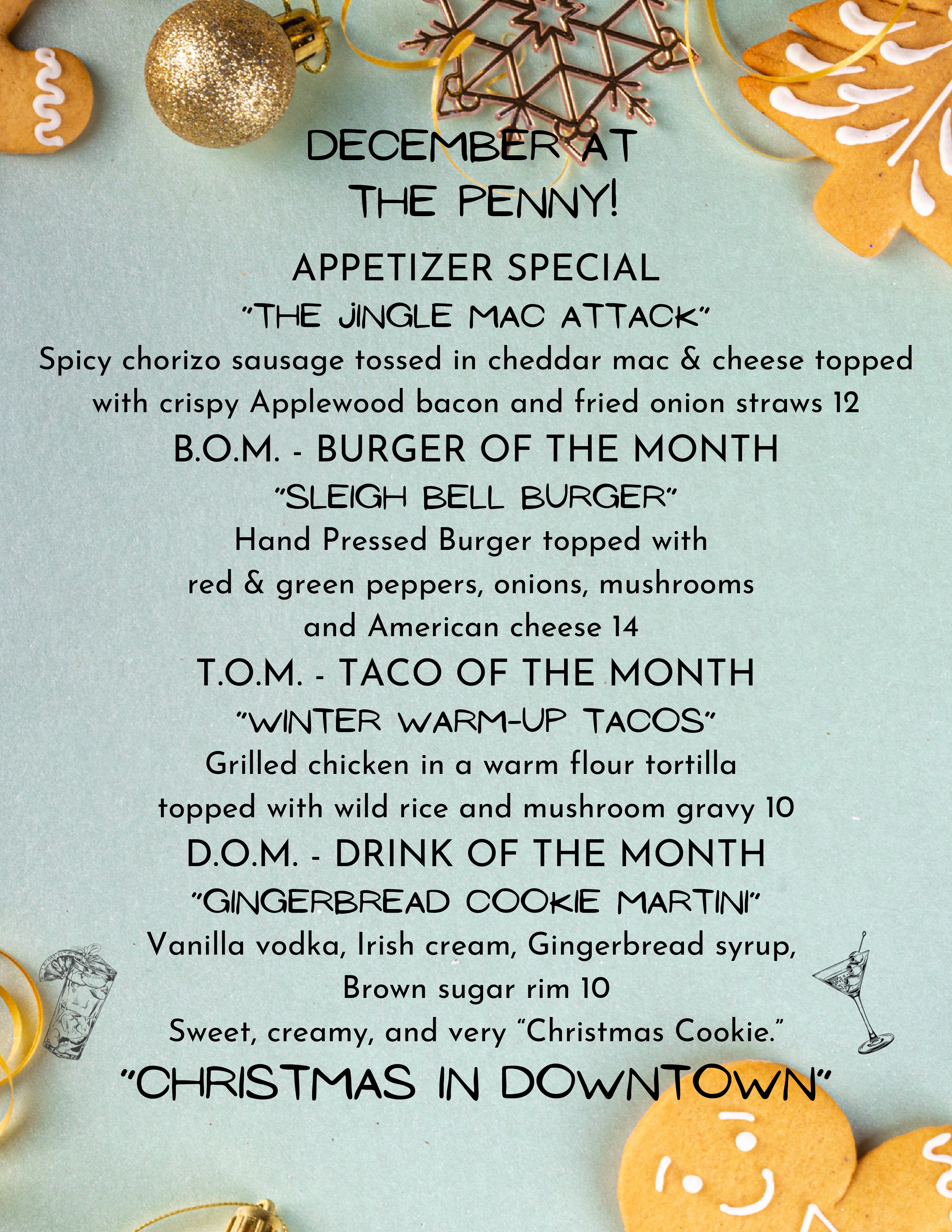 Gingerbread Christmas at The Penny is here all December! Step into gingerbread-themed décor, snap a few sweet photos, and enjoy limited-time Christmas treats on the menu. We’re hosting festive, family-friendly events all month long—stay tuned for the schedule. Bring the whole crew and celebrate the sweetest season at Copper Penny Grill.